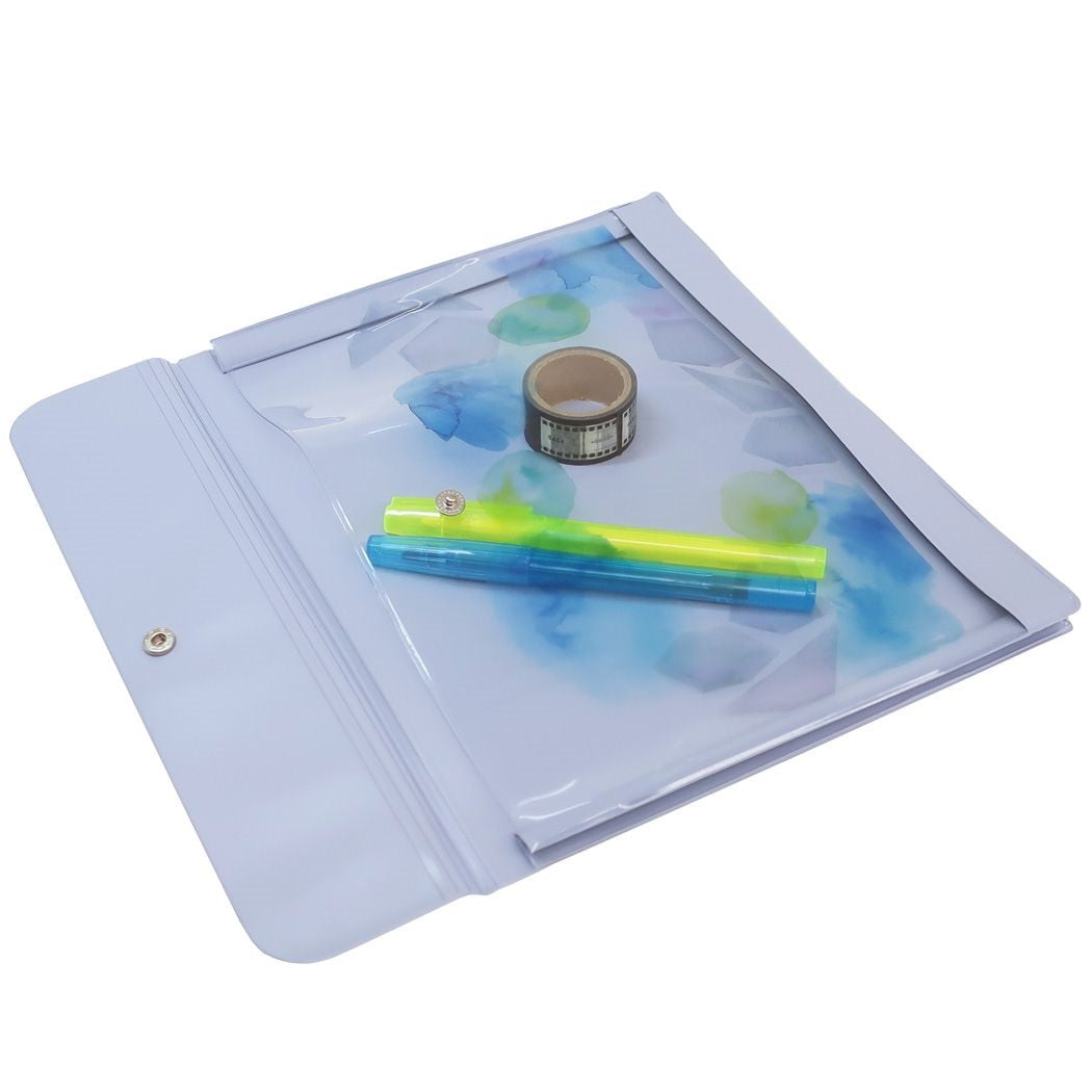 「ファイルその他」 エンベロープケース 書類ホルダー いろを楽しむ Green Flash カラーインクの世界を楽しめるおしゃれなステーショナリー こころおどるカラーインクの世界[いろを楽しむ]ステーショナリーシリーズインクの魅力である色の濃淡、にじみ、ゆらぎをデザインに落とし込んだおしゃれなシリーズですこちらは人気アイテム[エンベロープケース]透明にインクが映えるフラットタイプのPVCケースですマチ付きで小ぶりのインク瓶や同シリーズステーショナリーがまとめて収納できます同シリーズの文具いろいろあるのでお気に入りを揃えてくださいサイズ:約254x200x28mm素材:PVC[Made in Japan] カラー/ブルー系(青 紺 ネイビー) 小物入れ/書類入れ/書類ケース/透明ケース/クリアケース