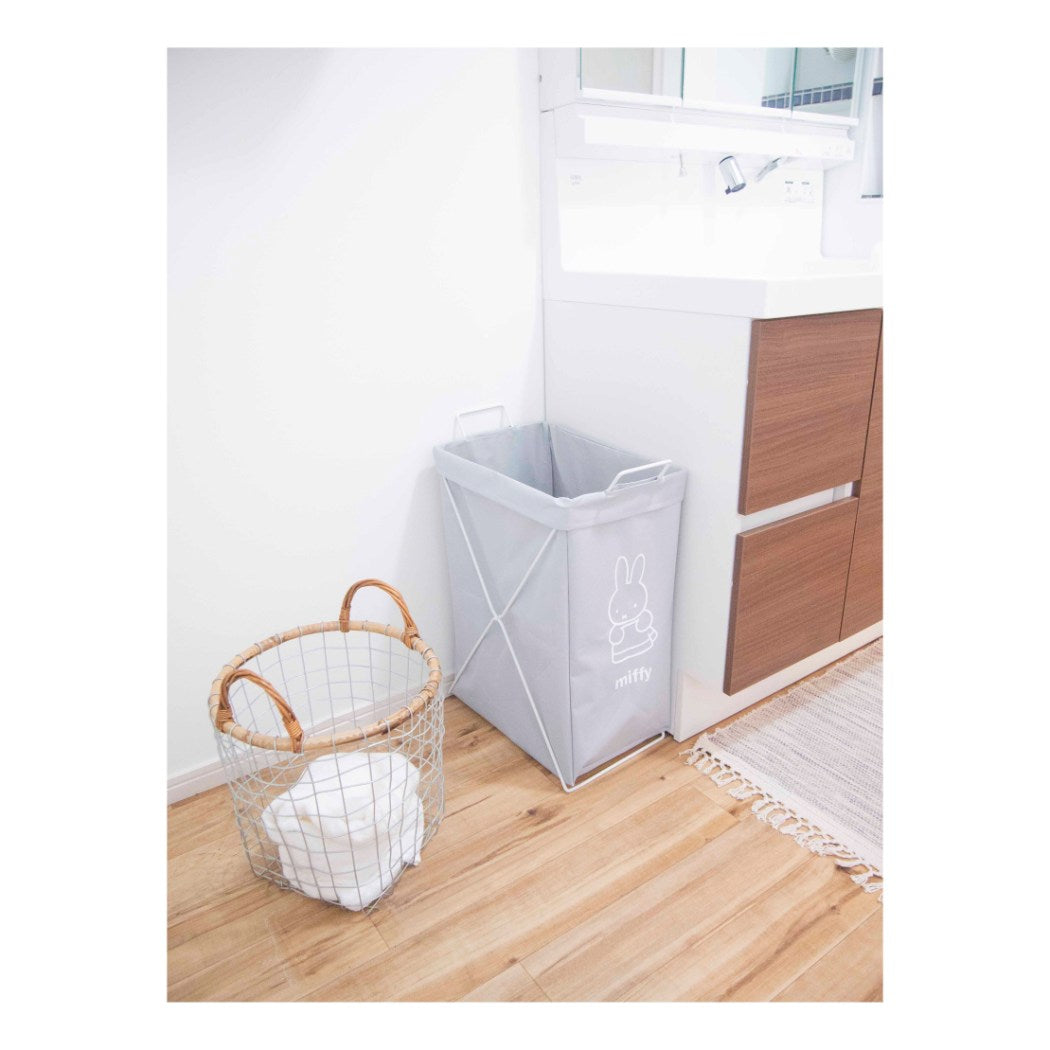 「洗濯 清掃用品」 ミッフィー 絵本キャラクター DickBruna 折り畳める ランドリーバスケット 収納用品 縦型 おきがえミッフィー ディックブルーナ miffyのシンプルでキュートな収納にもなるランドリーグッズ ミッフィーの折り畳めるランドリーバスケットシリーズ洗濯物の収納だけでなく、子供のおもちゃ入れや小物雑貨入れ、ダストボックスなど様々にお使いいただけます。縦長型で容量は洗濯物もしっかり入る約42L。使わないときは折りたたんでコンパクトに。バスケットの内側は防水加工が施されているので、洗濯物をベランダへ運ぶのにも便利です。サイズ:約240x555x420mm/広げた状態でフレームを含む容量:約42L カラー/グレー系(灰色 グレイ) ランドリーケース/ランドリーボックス/洗濯物入れ/洗濯カゴ/せんたくかご