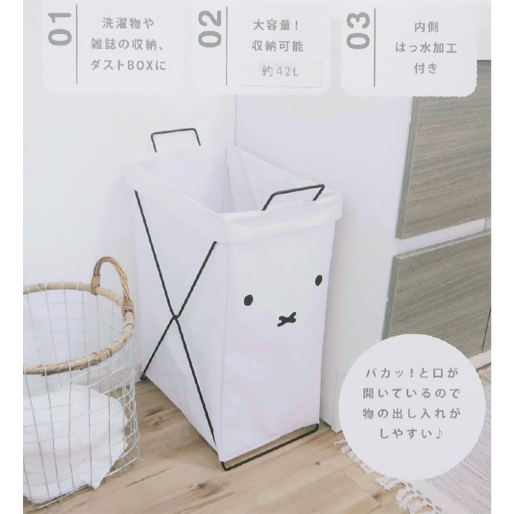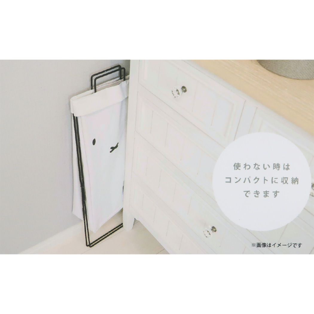「洗濯 清掃用品」 ミッフィー 折り畳めるランドリーバスケット 縦型 洗濯カゴ ディックブルーナ 絵本キャラクター miffyのシンプルでキュートな収納にもなるランドリーグッズ ミッフィーの折り畳めるランドリーバスケットシリーズ洗濯物の収納だけでなく、子供のおもちゃ入れや小物雑貨入れ、ダストボックスなど様々にお使いいただけます。横長型で容量は約42L。使わないときは折りたたんでコンパクトに。バスケットの内側は防水加工が施されているので、洗濯物をベランダへ運ぶのにも便利です。サイズ:約240x555x420mm/広げた状態でフレームを含む カラー/ホワイト系(白) 衣類 収納/インテリアグッズ/可愛い 洗濯カゴ/ゴミ箱/大容量 バスケット